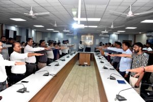 મોરબીમાં જિલ્લા કલેકટર કચેરી ખાતે જિલ્લા વહીવટી તંત્રના ઉચ્ચ અધિકારીઓ અને કર્મચારીઓ દ્વારા રાષ્ટ્ર ગીત વંદે માતરમના મૂળ સ્વરૂપનું સમૂહગાન કરવામાં આવ્યું હતું અને સ્વદેશીના શપથ લીધા હતા.