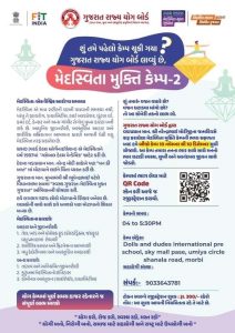 સરકારના FIT INDIA મૂવમેન્ટ અને સ્વસ્થ ગુજરાત મેદસ્વિતા મુક્ત ગુજરાત અભિયાન અંતર્ગત ગુજરાત રાજ્ય યોગ બોર્ડ દ્વારા ૧૦ નવેમ્બરથી ૧૦ ડિસેમ્બર દરમિયાન મેદસ્વિતા મુક્ત અભિયાન અંતર્ગત ખાસ કેમ્પનું આયોજન કરવામાં આવ્યું છે. જેમનું વજન વધારે છે અને મેદસ્વિતાનો શિકાર બન્યા છે તેવા લોકો વજન ઘટાડવા અને મેદસ્વિતાને નિયંત્રણમાં લાવવા તથા તેના નિવારણ માટે આ સોનેરી તકનો લાભ લઈ શકે છે.