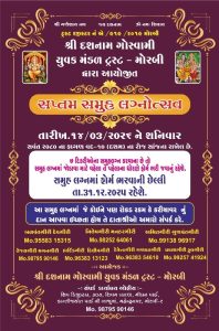 મોરબીઃ દશનામ ગોસ્વામી યુવક મંડળ દ્વારા સાતમાં સમૂહ લગ્નોત્સવ યોજાશે.જે ફાગણ વદ ૧૦ (દસમ),શનિવાર તા.૧૪-૩-૨૬ રોજ સાંજના રાખવામાં આવેલ છે સમૂહ લગ્નમાં જોડાવા ઈચ્છતા દશનામ સમાજના યુવક-યુવતીઓના વાલીઓ એ તા.૩૧-૧૨-૨૫ સુધીમાં સંપર્ક કરવા જણાવાયું છે ૭ દિકરીઓના સમુહ લગ્ન કરવાના છે .