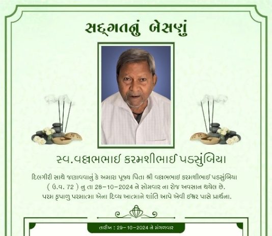 મોરબી : વલ્લભભાઈ કરમશીભાઈ પડસુંબીયાનું અવસાન, મંગળવારે બેસણું