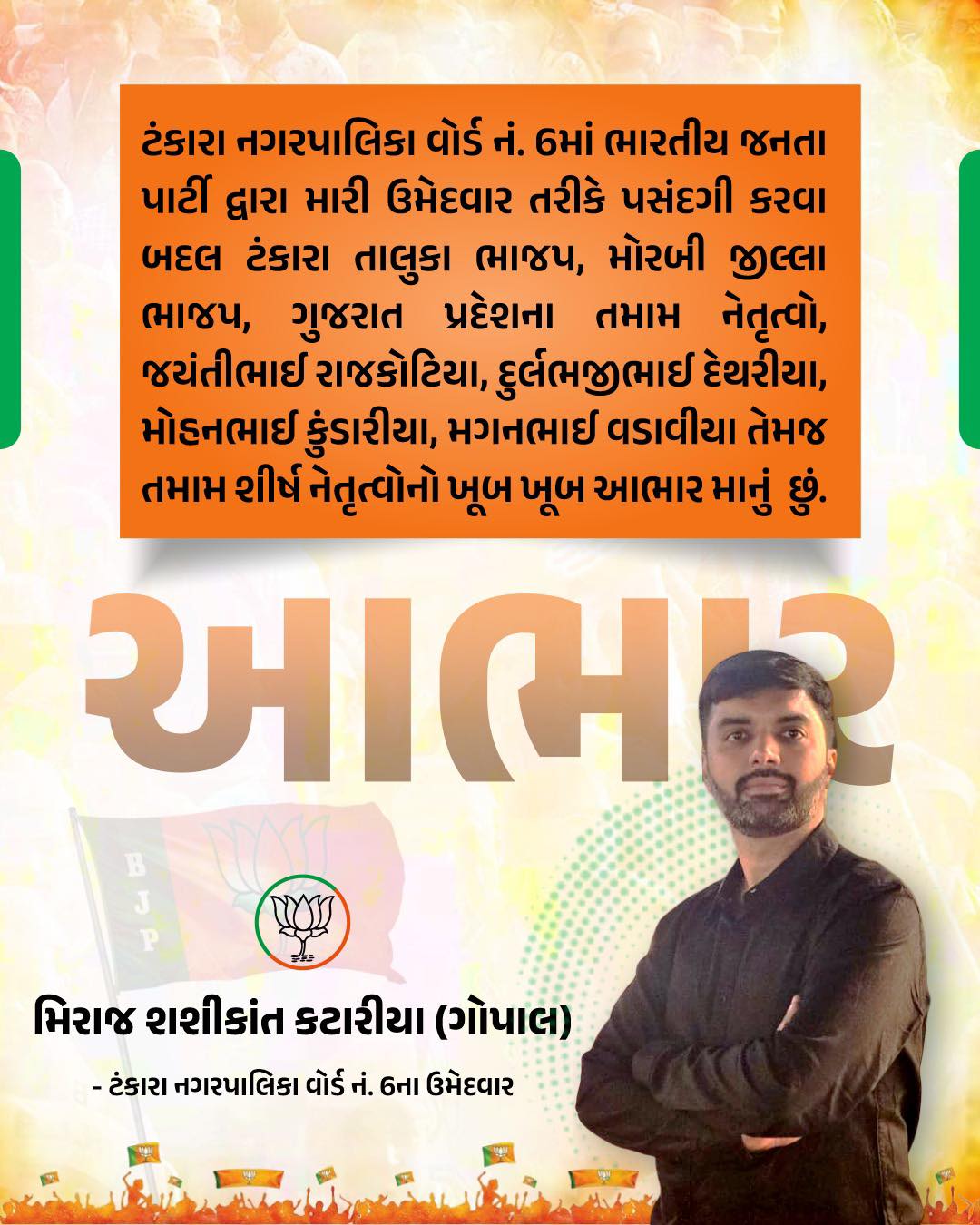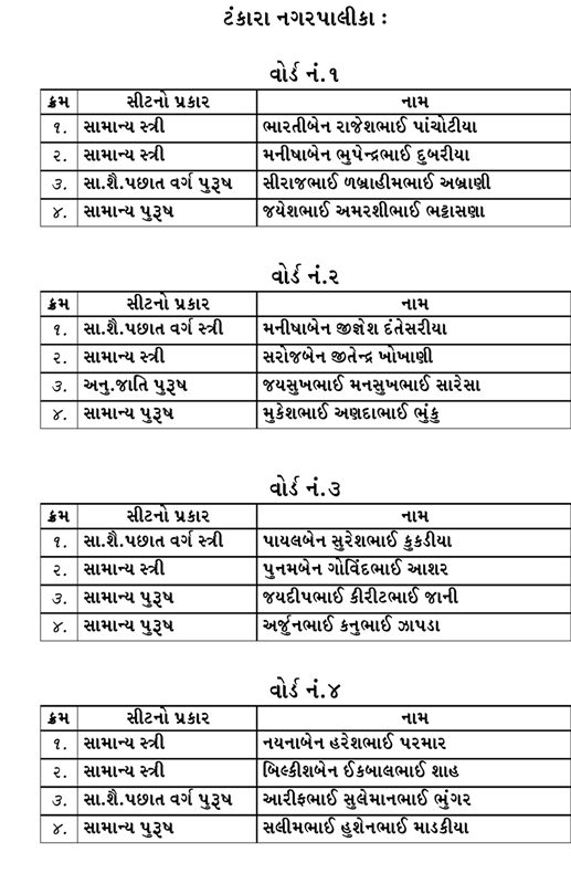 ટંકારા નગરપાલિકાની ચૂંટણી પ્રથમ વખત યોજાશે ભાજપ દ્વારા ઉમેદવારોની યાદી જાહેર કરી નથી પરંતુ ટેલિફોનિક સૂચનાઓ અપાઈ હોવાનું સામે આવ્યું અનેક ઉમેદવારોના ફોટો સોસીયલ મીડિયામાં પણ જોવા મળી રહ્યં છે હાલ તમામ 24 ઉમેદવારોના ફોર્મ ભરીને તૈયાર રખાયા સ્થાનિક સ્તરેથી ઉમેદવારોની જાહેરાત કરી દેવાઈ હજુ ભાજપ તરફથી ઔપચારિક જાહેરાત કરવાનું બાકી હોય તેવું સૂત્રોએ જણાવ્યું છે