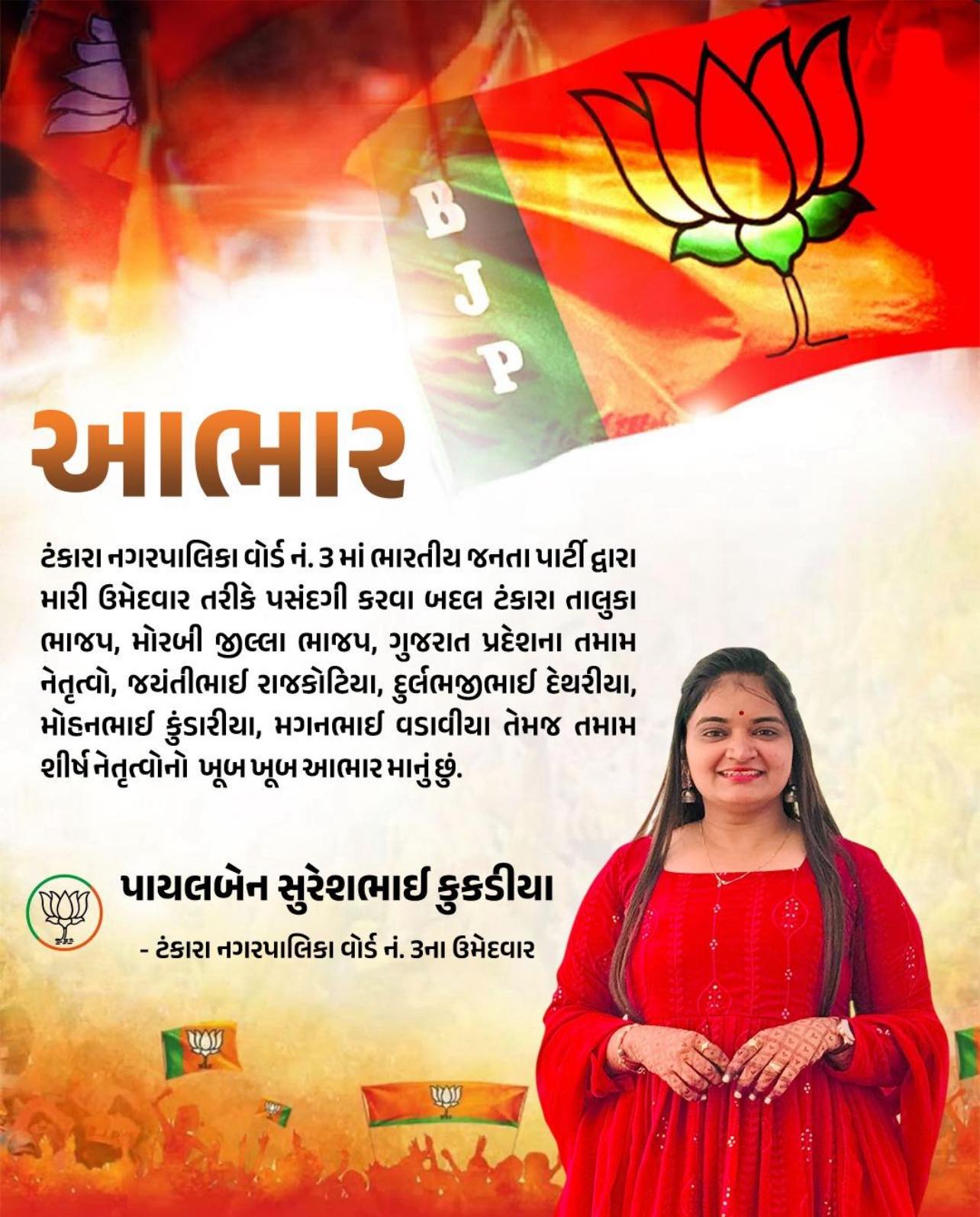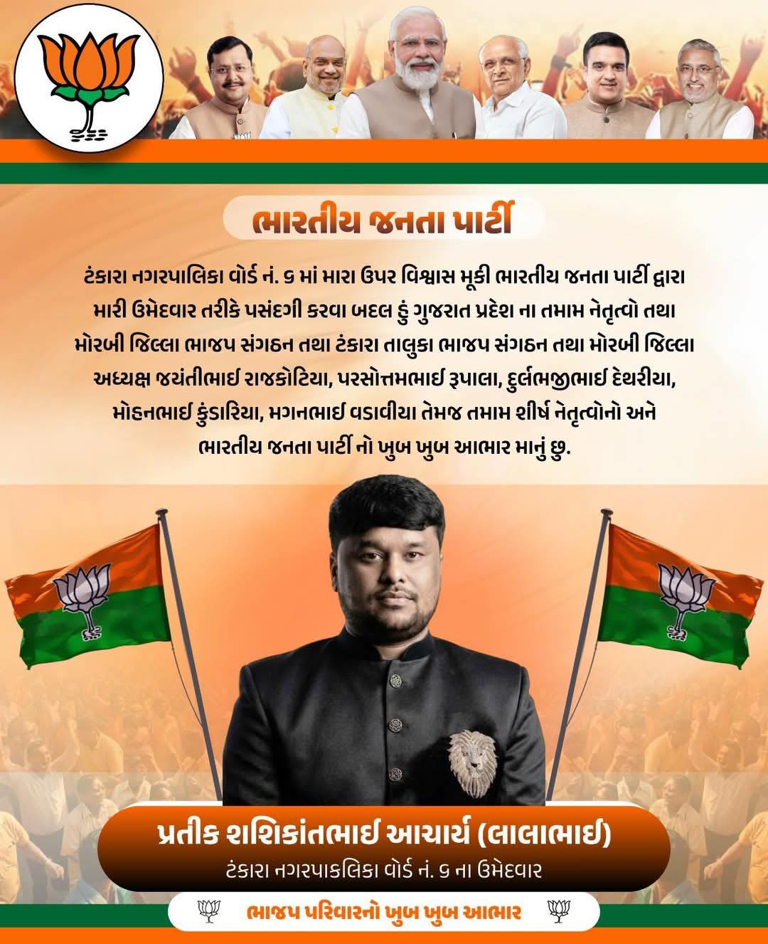 ટંકારા નગરપાલિકાની ચૂંટણી પ્રથમ વખત યોજાશે ભાજપ દ્વારા ઉમેદવારોની યાદી જાહેર કરી નથી પરંતુ ટેલિફોનિક સૂચનાઓ અપાઈ હોવાનું સામે આવ્યું અનેક ઉમેદવારોના ફોટો સોસીયલ મીડિયામાં પણ જોવા મળી રહ્યં છે હાલ તમામ 24 ઉમેદવારોના ફોર્મ ભરીને તૈયાર રખાયા સ્થાનિક સ્તરેથી ઉમેદવારોની જાહેરાત કરી દેવાઈ હજુ ભાજપ તરફથી ઔપચારિક જાહેરાત કરવાનું બાકી હોય તેવું સૂત્રોએ જણાવ્યું છે